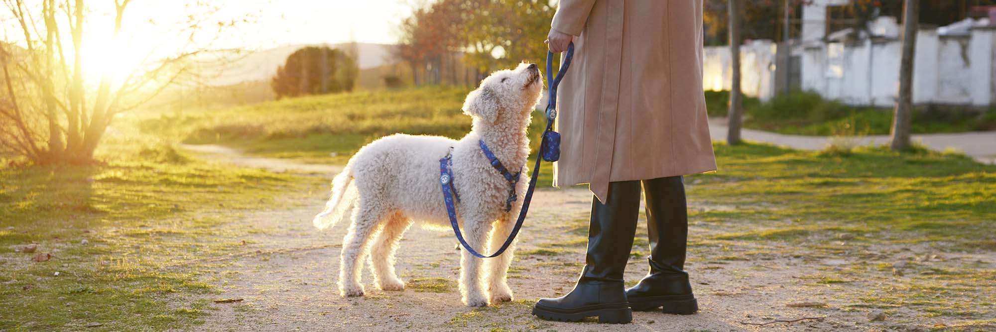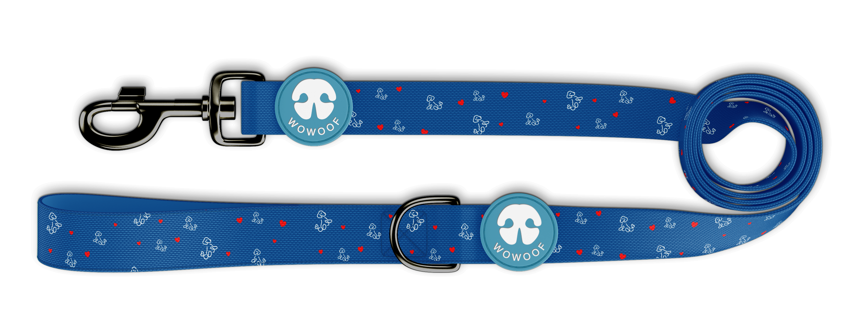 ¡Amor y estilo en cada paseo con la correa de perro LOVE DOG!. Diseño de la silueta de un perro con corazones rojos sobre fondo azul marino, una expresión de cariño en cada paso.
