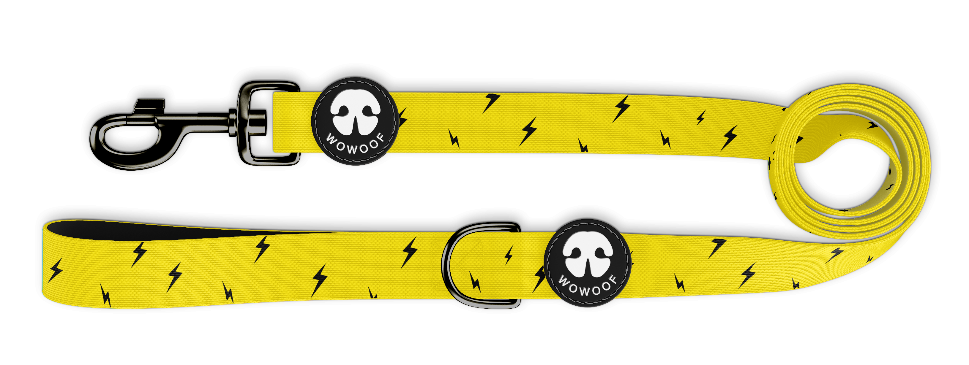 ¡Brilla en cada paseo con la correa de perro PINK RAY!. Rayos negros sobre fondo amarillo fosforescente, tu perro será el rey de la calle y la noche.